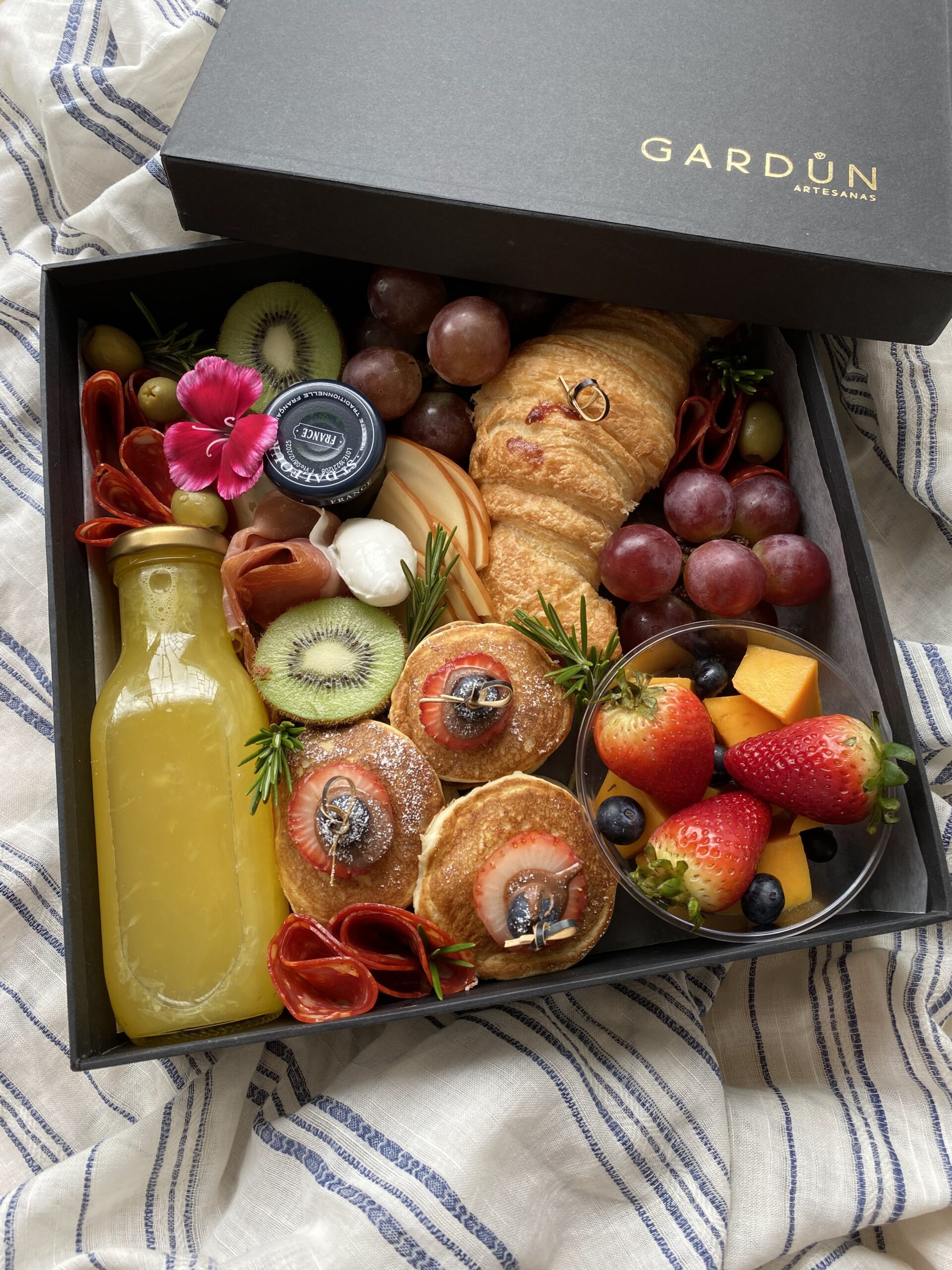 – queso manchego y gouda ahumado – salami y chorizo vela – uvas- fresas-mermelada -jamón serrano.