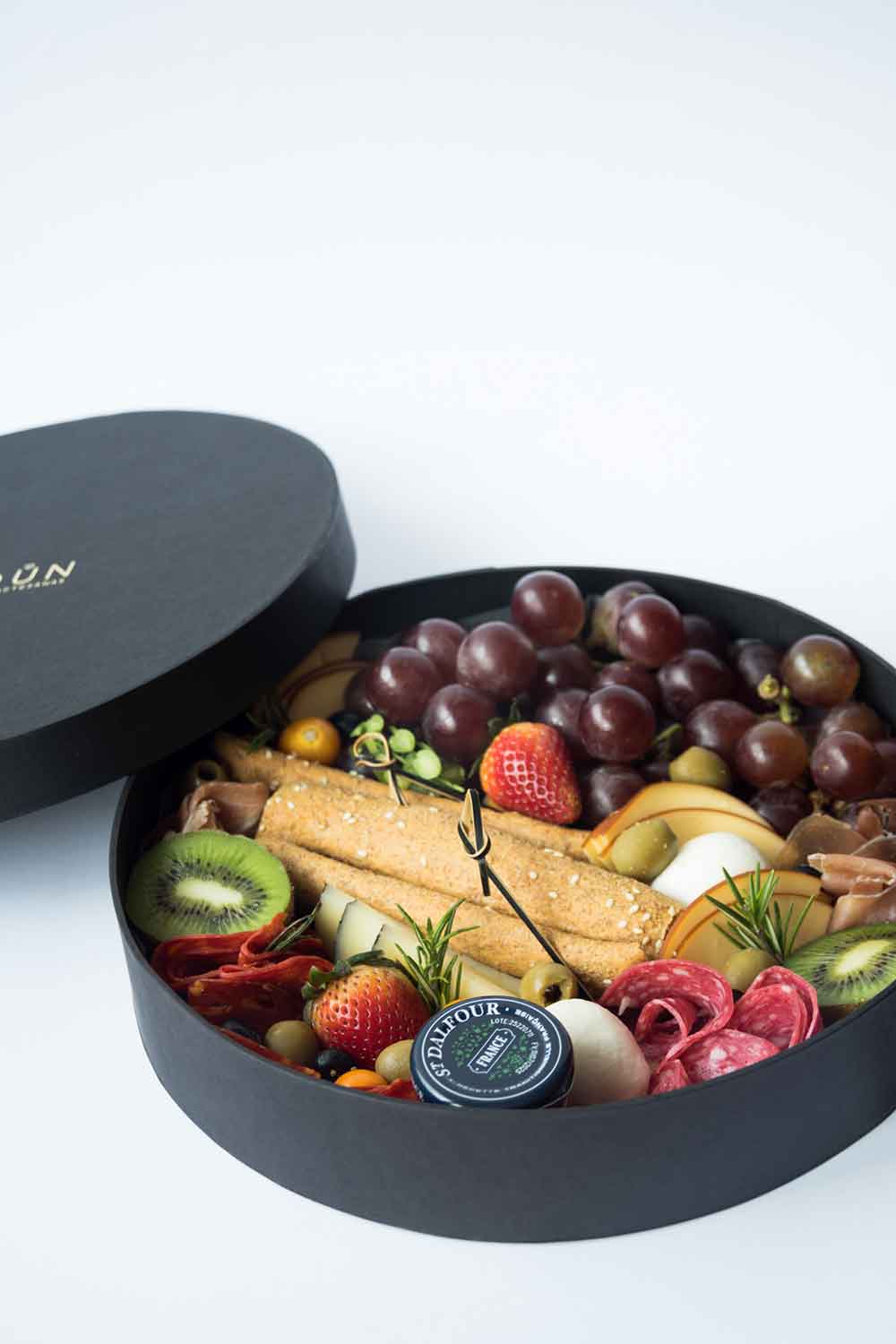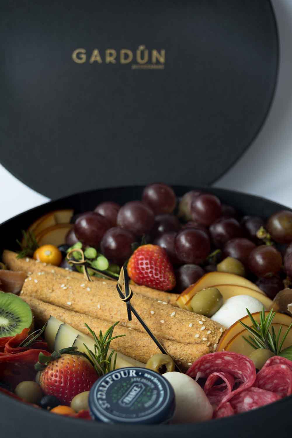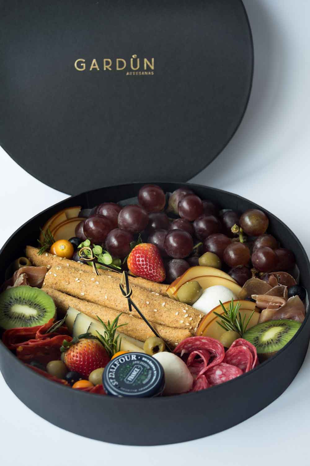 - Chorizo vela + salami + jamón serrano + queso gouda ahumado + queso manchego + mozzarella de bufala + queso brie + mermelada + grisines de ajonjolí + uvas + kiwi + fresas + arándanos + aceitunas (para 1-2 personas).