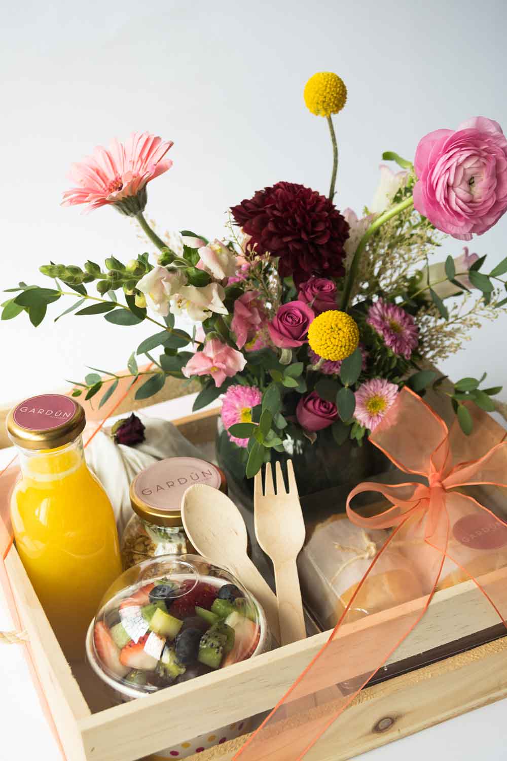 - Jugo de naranja natural + parfait con yogurt griego, granola y fruta + fruta picada (mango, fresas, uvas, kiwi, arándanos) + sándwich Gardun (Pan baguette + tomate en aceite de oliva + mozzarella + jamón de pavo + aguacate) + torta 2 porciones empaque de tela sabor disponible.