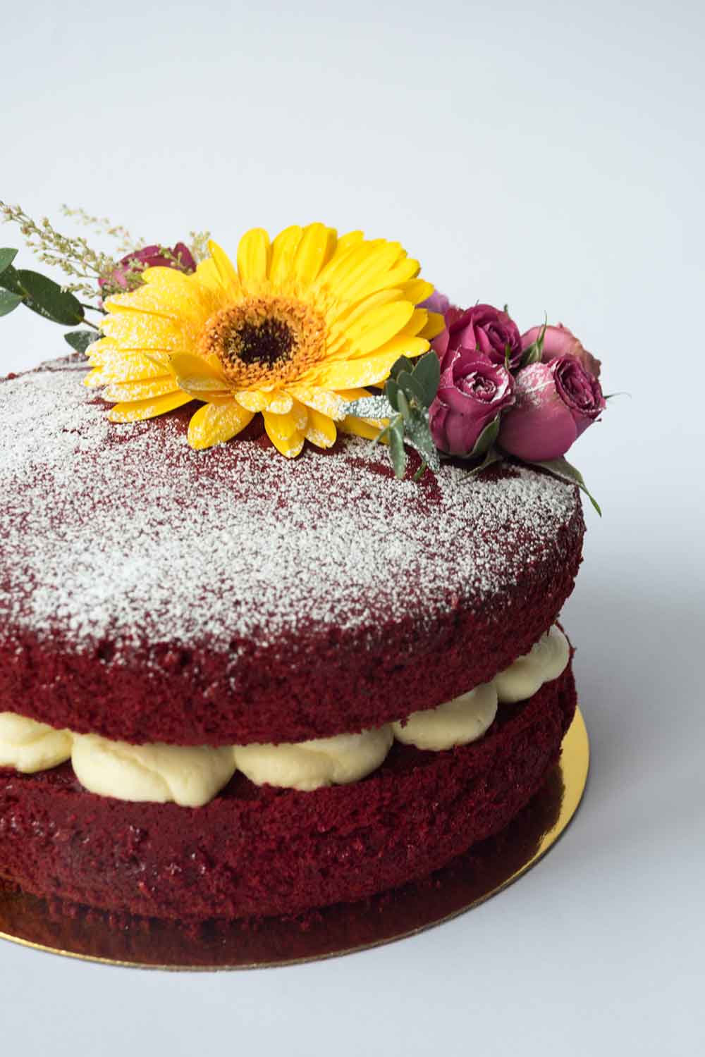 Torta artesanal red velvet (terciopelo rojo) rellena de frosting de queso crema sin conservantes ni saborizantes artificiales a base de harina de trigo y azúcar blanca. Para 8-10 porciones decorada con flores naturales de temporada disponibles.